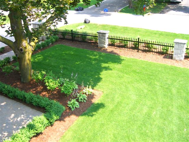 tree 7. Privacy decorative structure - south 8. Circular fountain near the house 9. New doge run, sod, tree, and